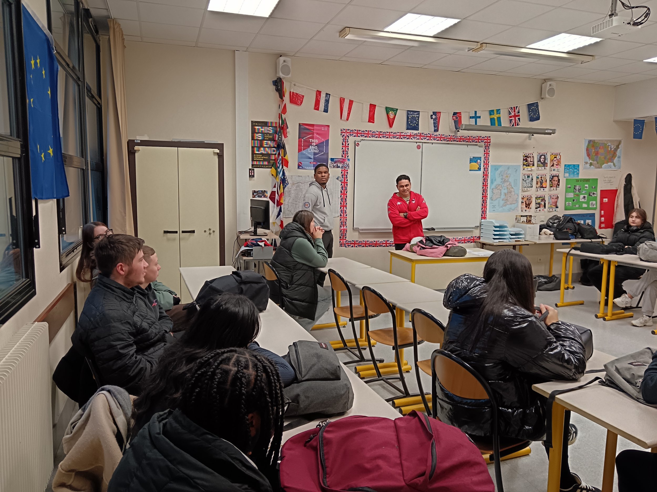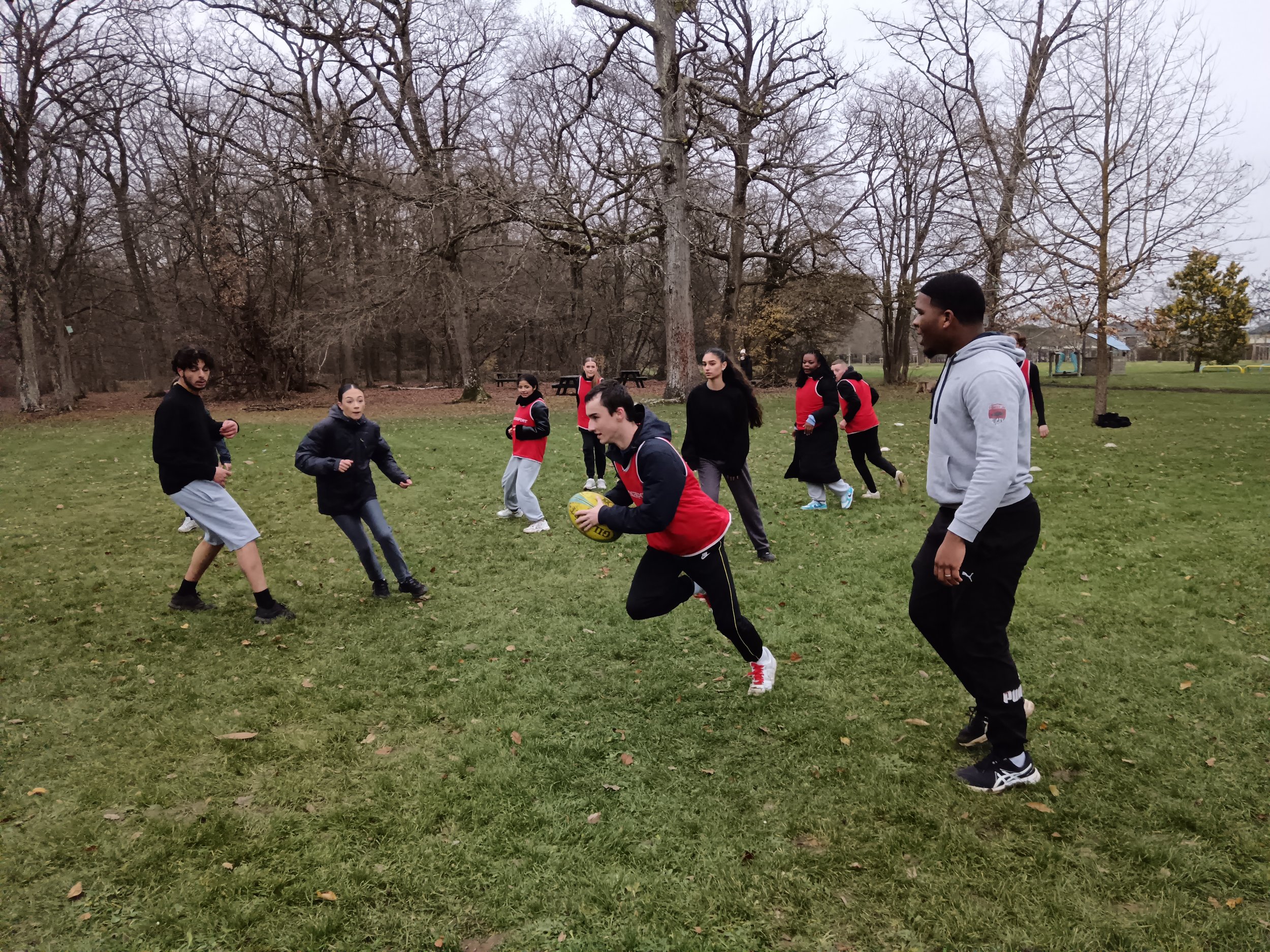 Dans ce cadre-là, afin de créer une cohésion du groupe les élèves ont participé à une initiation rugby avec 4 intervenants du club de rugby d’Evreux : Estelle, Kynaël (ancien élève de la filière AGORA actuellement en BTS), Nathan et David LEMI, ancien joueur international originaire de Samoa.